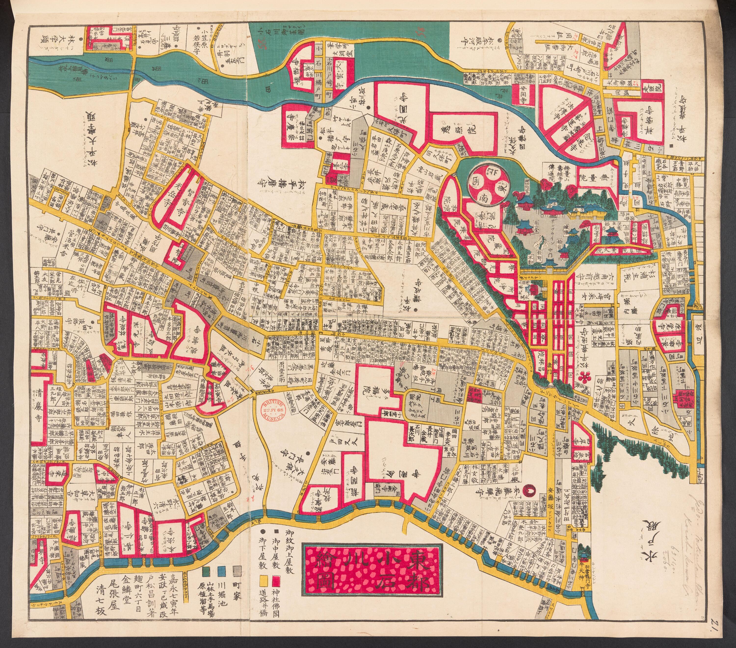 地図備考(日): *多色刷り。『江戸切絵図集成』第五巻所収の安政4訂・図に該当。外題「小石川絵図」。(刊記)嘉永七寅年/安政丁巳歳改/戸松昌訓著/麹町六丁目/金鱗堂/尾張屋/清七板。英数字・片仮名書き入れ多し。