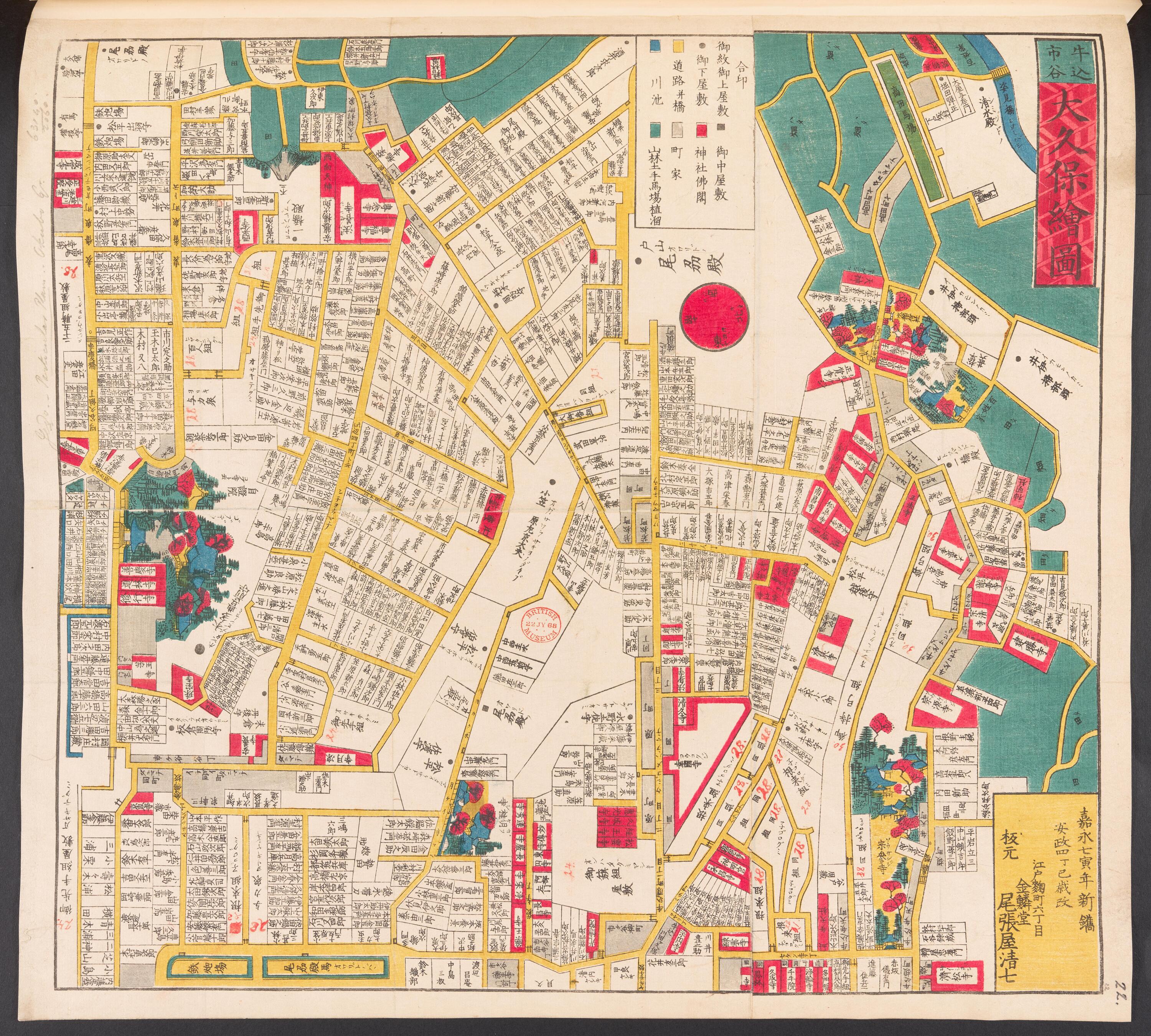 地図備考(日): *多色刷り。『江戸切絵図集成』第五巻所収の安政4初図に該当。図者は嘉永7原板(『江戸切絵図集成』第5巻所収)による。外題「大久保絵図」。(刊記)嘉永七寅年新鐫/安政四丁巳歳改/江戸麹町六丁目/金鱗堂/板元尾張屋清七。英数字・片仮名書き入れ多し。