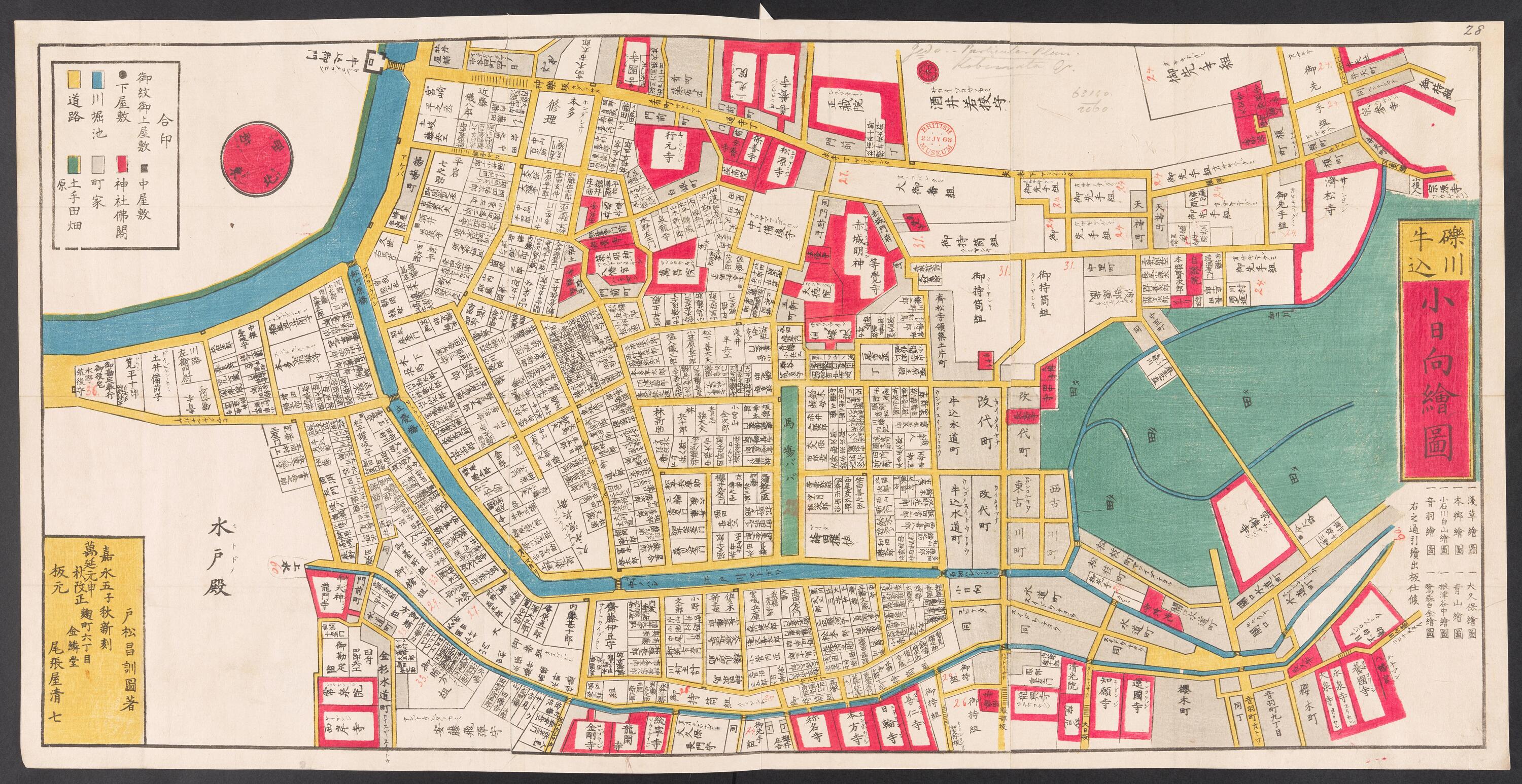 地図備考(日): *多色刷り。『江戸切絵図集成』第五巻所収の万延1図初に該当。外題「小日向絵図」。(刊記)戸松昌訓図著/嘉永五子秋新刻/万延元申秋改正/麹町六丁目/金鱗堂/板元尾張屋清七。英字・片仮名書き入れ多し。