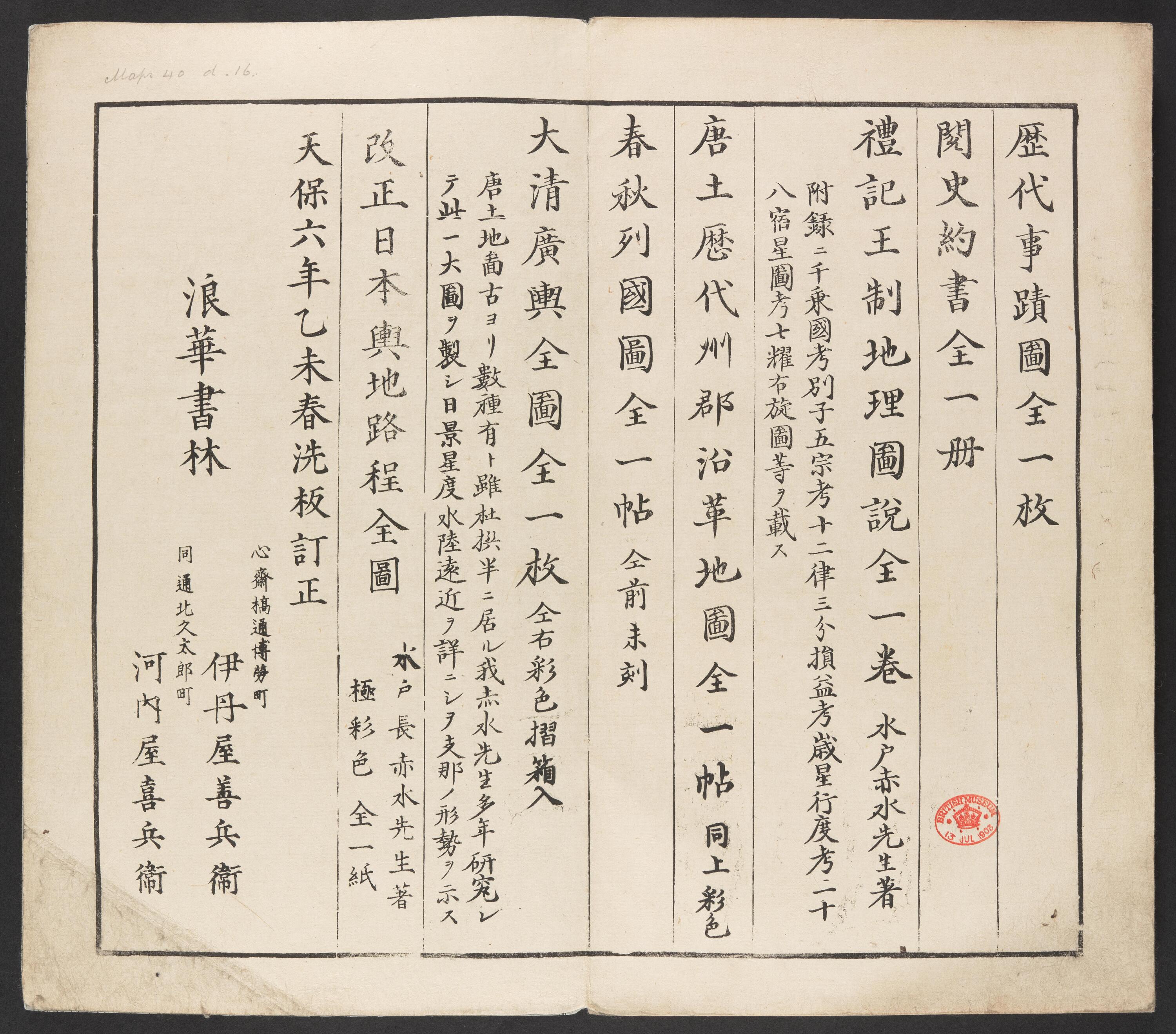 地図備考(日): *多色刷。(刊記書肆)天保六年乙未春_板訂正/浪華書林/伊丹屋善兵衛・河内屋喜兵衛。