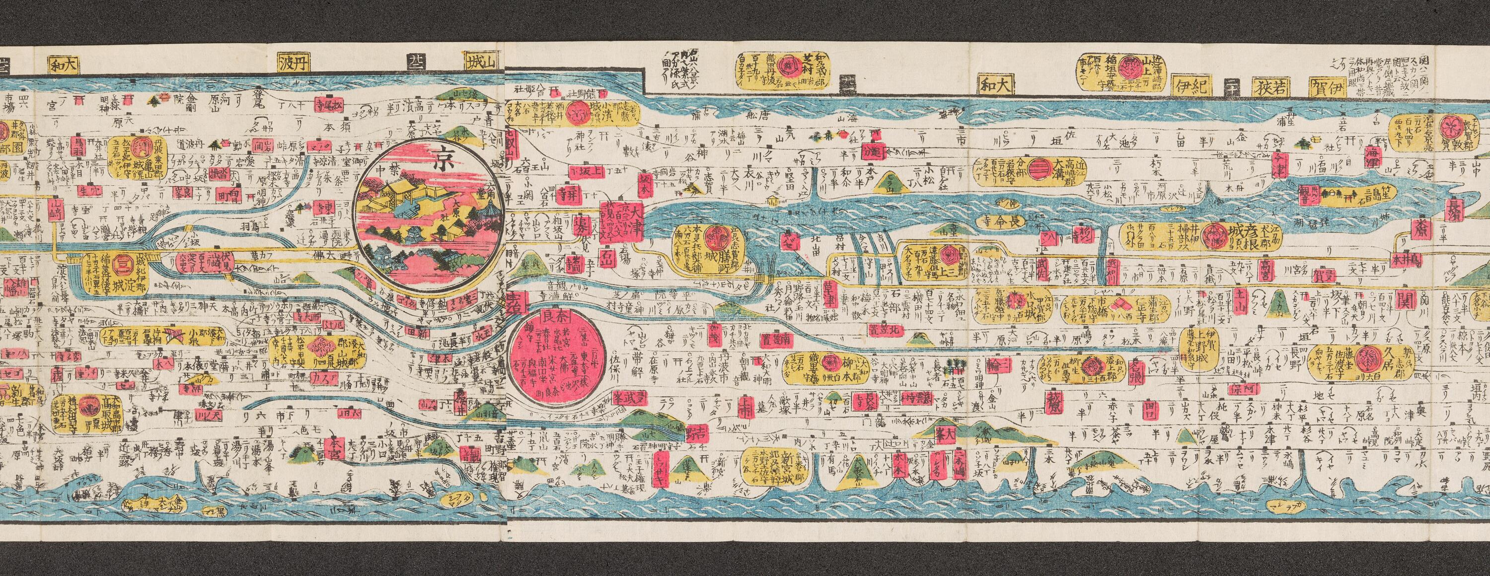 地図備考(日): *多色刷り。折り本。刊記書肆「弘化三丙午年秋発行/嘉永三庚戌年秋開版/書林甘泉堂東都、和泉屋市兵衛板」。