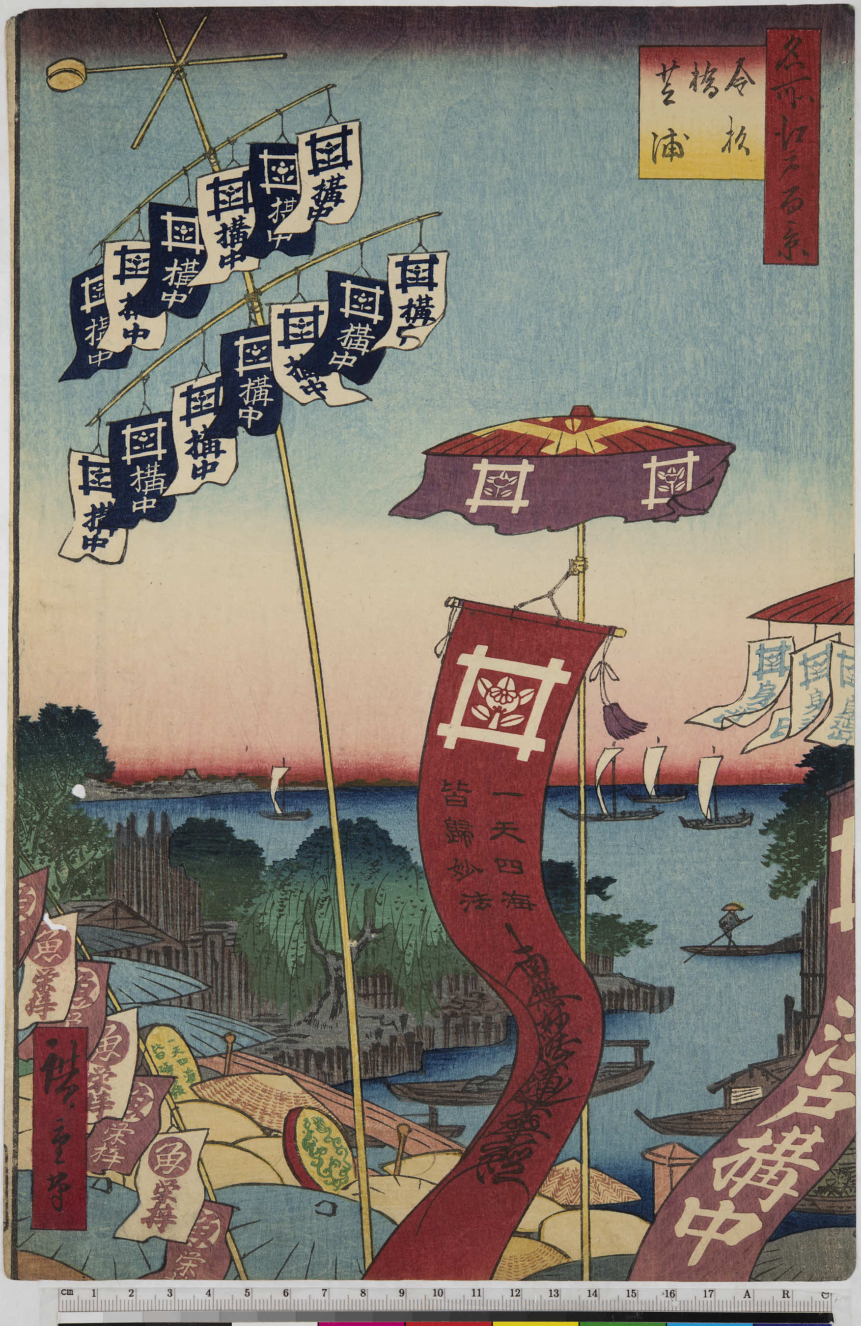 Group Description:目録1枚・広重肖像1枚・画図119枚。目録に拠ると春の部42枚・夏の部30枚・秋の部26枚・冬の部20枚の計118枚。目録外1枚。以下目録題。(春の部) 001日本ばし・002霞が関・003山下御門内・004永代白魚船・005両国ノ相撲・006初音の馬場・007大伝馬町・008駿河町・009八辻が原・010神田明神・011上野清水・012同山下・013同広小路・014日暮里・015同諏訪・016千駄木団子坂・017飛鳥山・018王子いなり・019同大滝・020川口のわたし・021芝あたご・022ふる川・023千代が崎・024目黒新ふじ・025同元ふじ・026八景坂・027蒲田の梅・028御てん山・029砂むら・030梅屋しき・031吾妻森・032やなきしま・033四ツ木の引舟・034墨水夜景・035水神の杜・036真先の辺・037今戸の煙・038新吉原・039大川ばし・040関口水道端・041市谷八幡・042玉川堤/(夏の部)043日本橋・044おなしく通一丁め・045八つ見のはし・046鎧のわたし・047昌平はし・048水道橋・049王子不動のたき・050十二荘・051糀まち・052赤坂桐はたけ・053増上寺・054外さくら田・055佃住よし・056万年はし・057中洲・058大はしの夕立・059両国川船中・060同大かははた・061首尾の松・062こまかた堂・063あやせ川・064ほり切・065亀戸の藤・066五百羅かむ・067逆井・068深川八まん山開・069三十三けん堂・070中川くち・071とねかは・072はねた/(秋の部)073市中の七夕・074大丸屋・075紺屋町・076京ばし・077鉄炮洲・078つきぢ・079芝明前・080金杉橋・081高なは・082月の岬・083品川洲崎・084目黒爺茶や・085紀伊くに坂・086内藤新宿・087井の頭・088滝の川・089月の松弁天・090猿若街・091向島秋葉・092木母寺・093にい宿・094真間・095鴻の台・096堀江猫実・097小名木川の松・098両国の花火/(冬の部)099浅草寺の雪・100日本堤・101酉の市・102三川しま・103千住大橋・104小梅つゝみ・105御厩川岸・106木場・107十万坪・108芝浦・109さめ洲・110千束の池・111目黒太鼓橋・112藪小路・113とらのもん・114ひく尼はし・115高田の馬場・116姿見のはし・117ゆしま天神・118王子装束榎/(目録外)119赤坂桐畑雨中夕けい
