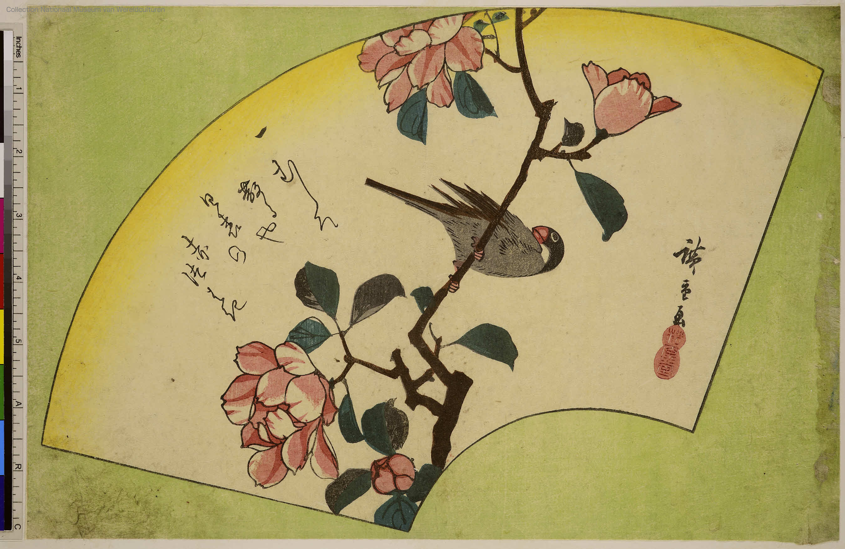 Genre:  扇面  花鳥画  俳諧   Theme:  赤椿と文鳥
