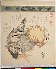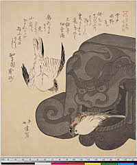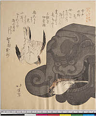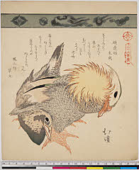 | 分類 摺物 狂歌 花鳥画 画題 鴛鴦 シリーズNo. 名 三十六禽続(七宝連) 資料部門 浮世絵 | ||||