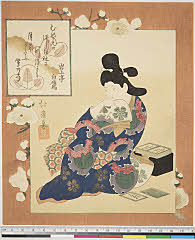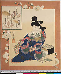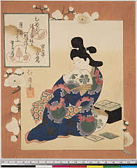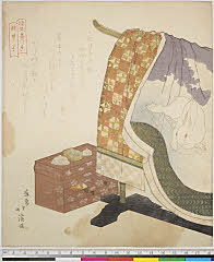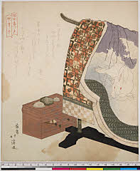| 分類 摺物 狂歌 器物 画題 兎模様の打掛 箪笥型煙草盆ヵ シリーズNo. 名 睦側番つゝき(枕草子) 資料部門 浮世絵 | ||||