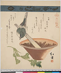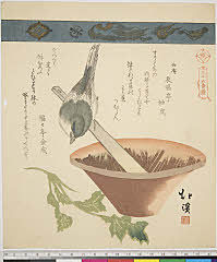 | 分類 摺物 狂歌 花鳥画 画題 鴬 擂鉢 シリーズNo. 名 三十六禽続(七宝連) 資料部門 浮世絵 | ||||