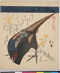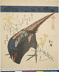 | 分類 摺物 狂歌 花鳥画 画題 雉子 シリーズNo. 名 三十六禽続(七宝連) 資料部門 浮世絵 | ||||