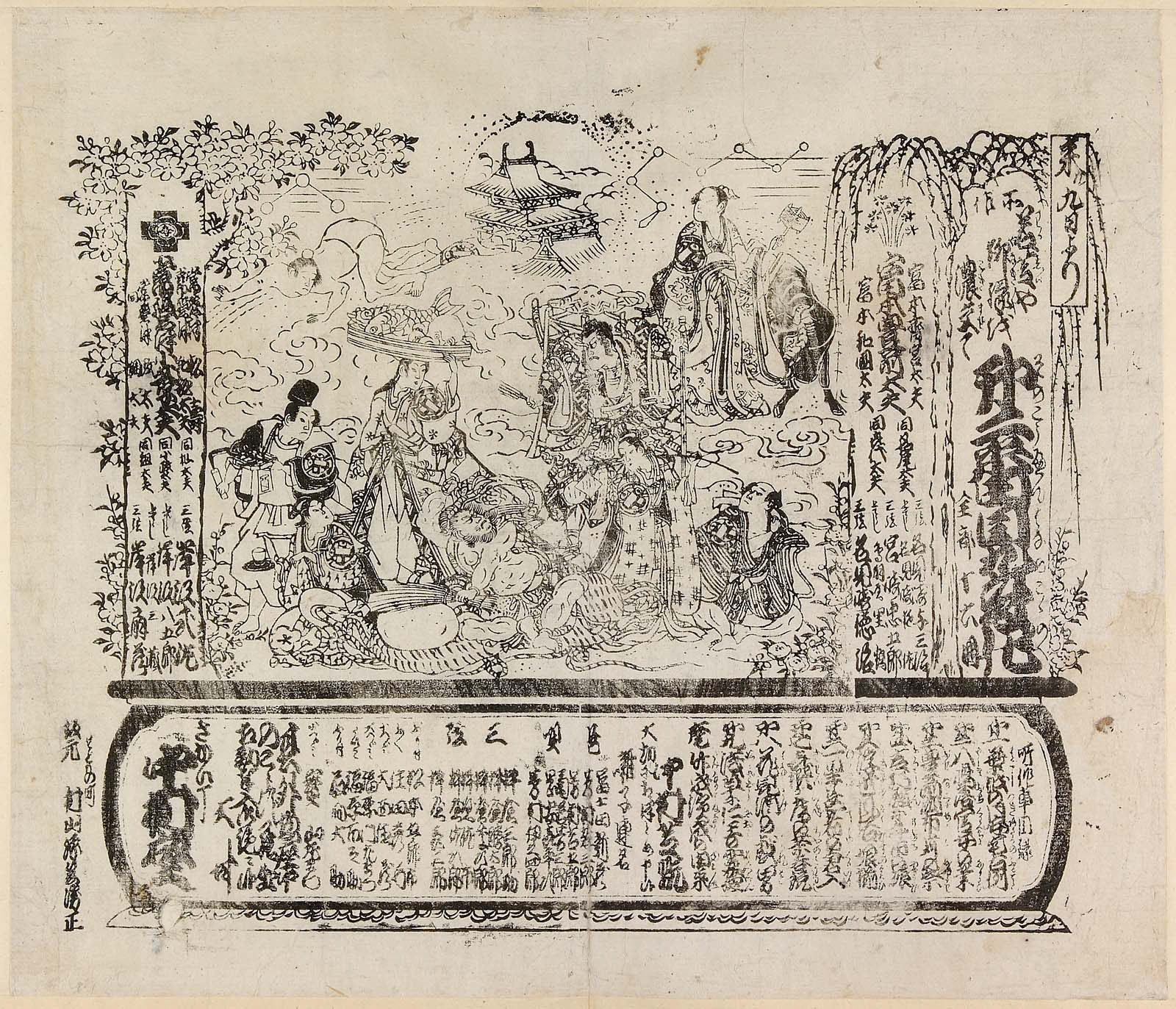 第二番目九変化 (そのこうへんはなのここのえ) 16冊 第一 葉越の月安宅古例、第二 八島落官女の業、第三 豊前国和布苅の祭、第四 吉行殿牛市の賑、第五 浮世風俗娘揃、第六 一星長者の倉入、第七 喜撰が庵の茶呑説、第八 花見酒の戯れ男、第九 浅草に仁王の霊験、大尾 竹成浜成の由来