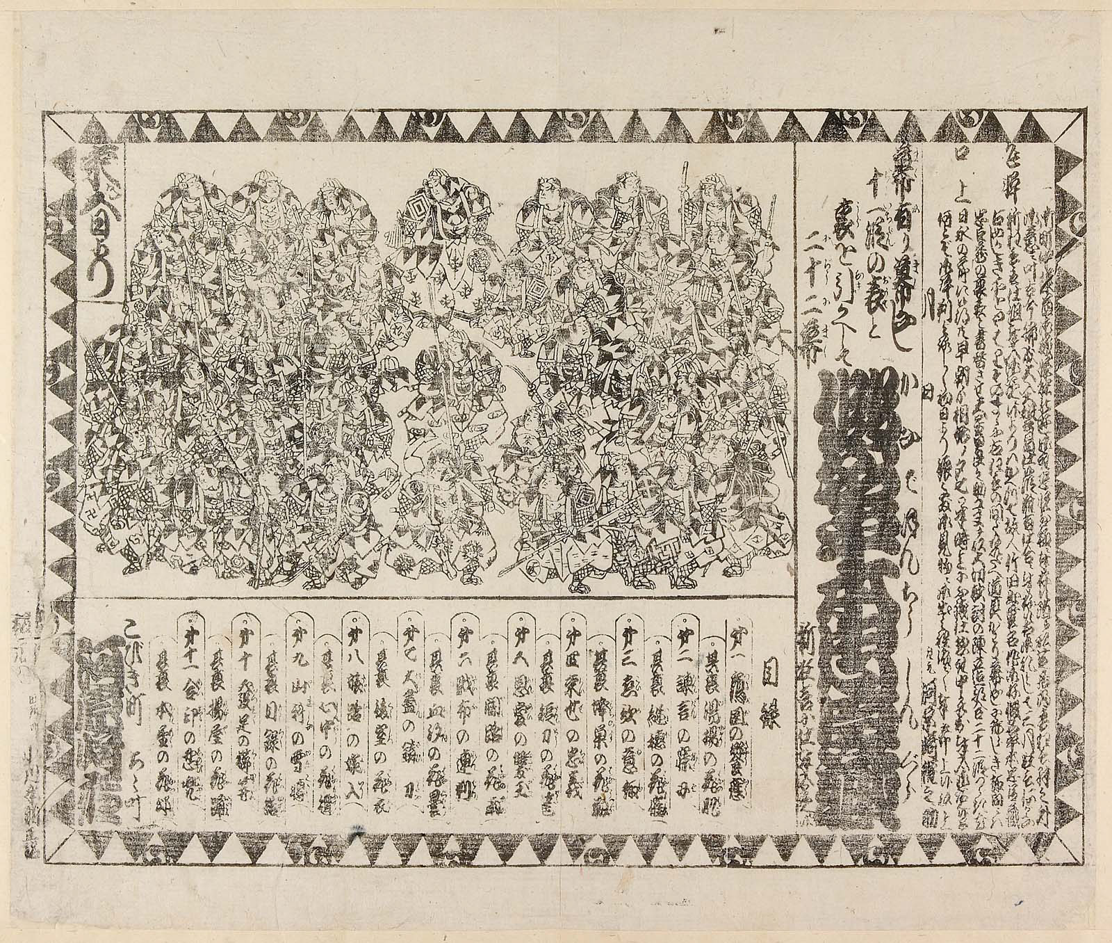 書替新狂言 仮名手本忠臣蔵 (かなでほんちゅうしんぐら) 11段の裏と表22幕 第一 鶴岡の饗応、其裏 湯揚の花肌、第二 諫言の寐刃、其裏 継穂の花催、第三 恋歌の意趣、其裏 蜂巣の花靭、第四 来世の忠義、其裏 短刀の花筺、第五 恩愛の双玉、其裏 闇路の花雨、第六 財布の連判、其裏 血汐の花曇、第七 大尽の錆刀、其裏 後室の花衣、第八 旅路の嫁入、其裏 心中の花氈、第九 山科の雪転、其裏 目録の花結、第十 発足の櫛笄、其裏 揚屋の花踊、第十一 合印の忍兜、其裏 本望の花邸