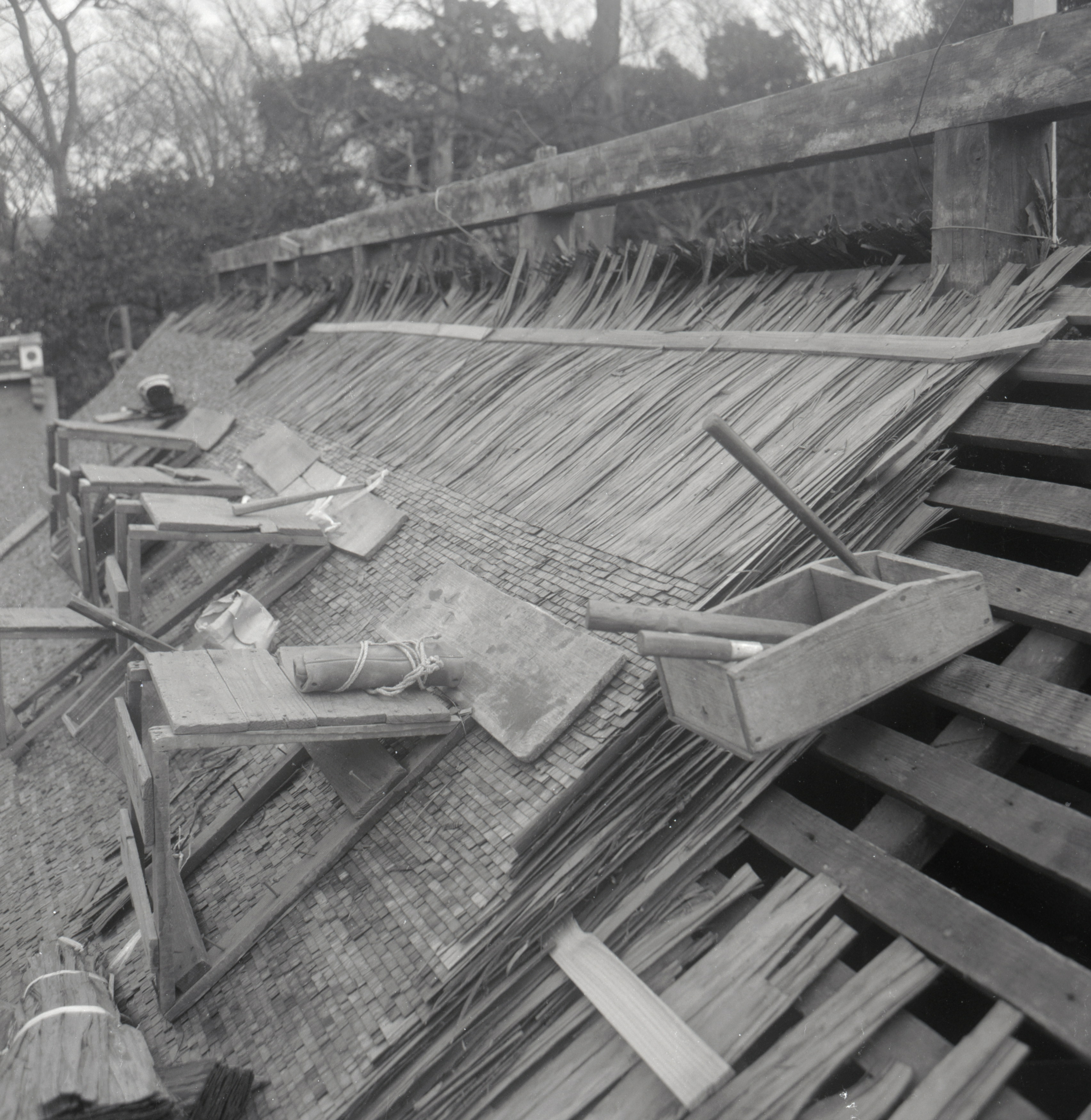 書込み: 賀茂御祖神社橋殿檜皮葺上げ中(北流れ)