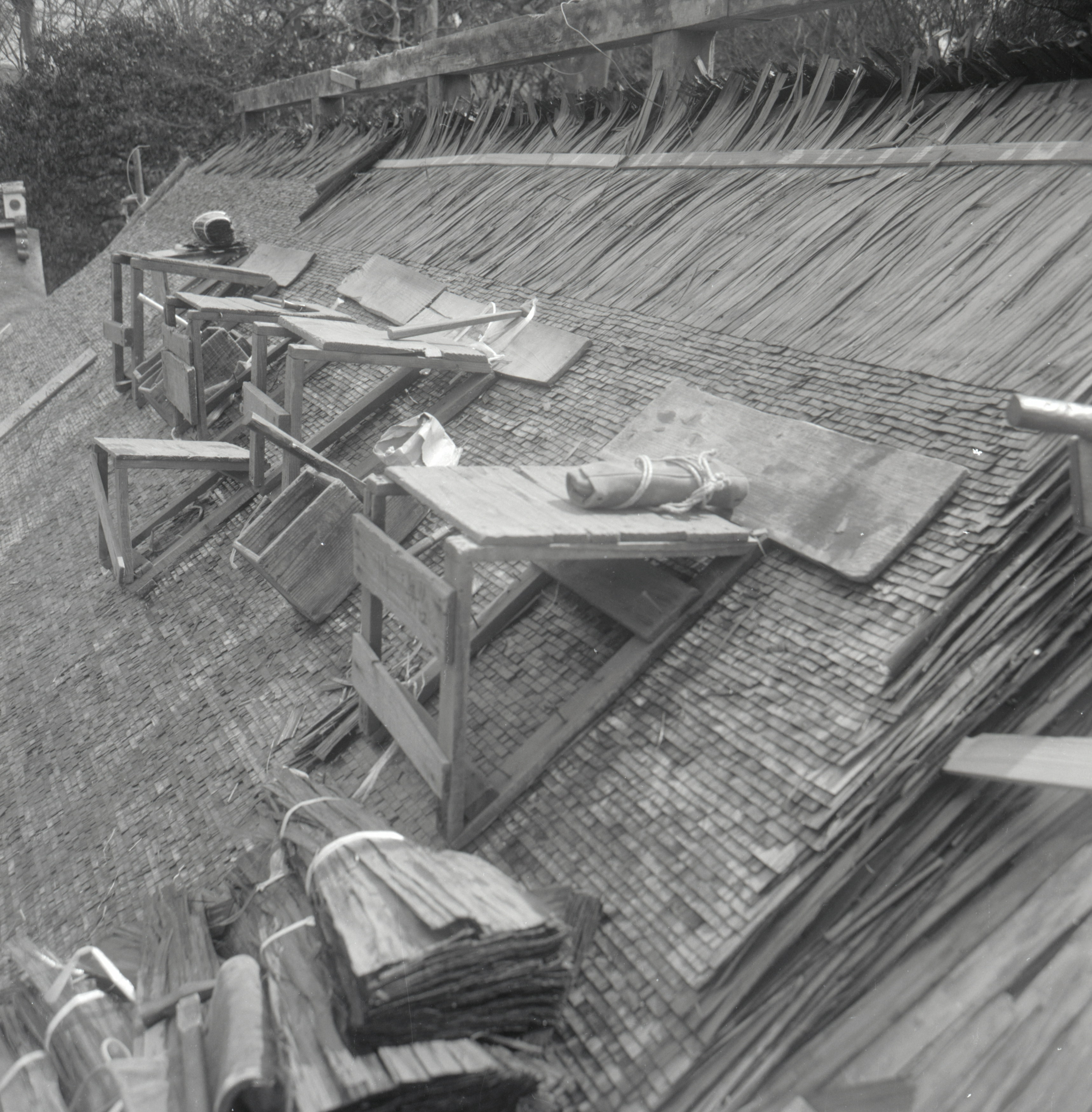 書込み: 賀茂御祖神社橋殿檜皮葺上げ中(北流れ)