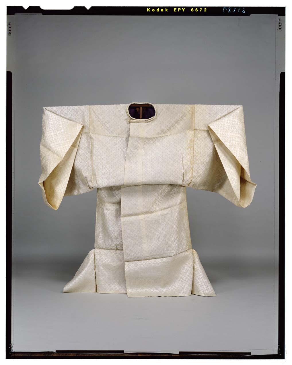 | Commentary | The court costume nōshi has a round collar and broad, open sleeves, like the kariginu. Its front panels are wider than those on the kariginu. Like the happi, the nōshi has an extra band of cloth at the hem that joins the front panels with the back panels. Here, the small repeat "koaoi" pattern of central flowers in a diagonal leaf lattice is rendered in discrete white on white. | |||||||